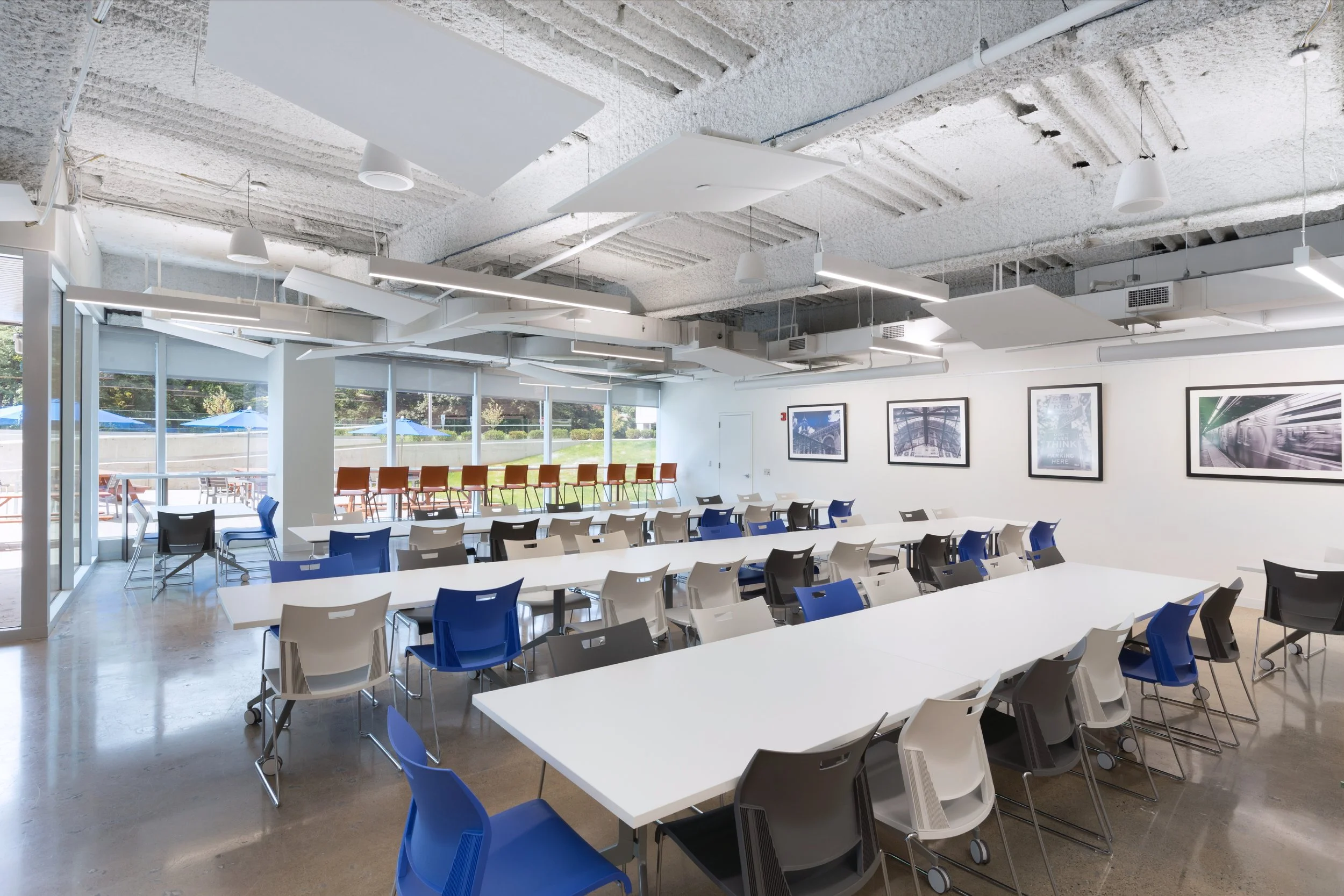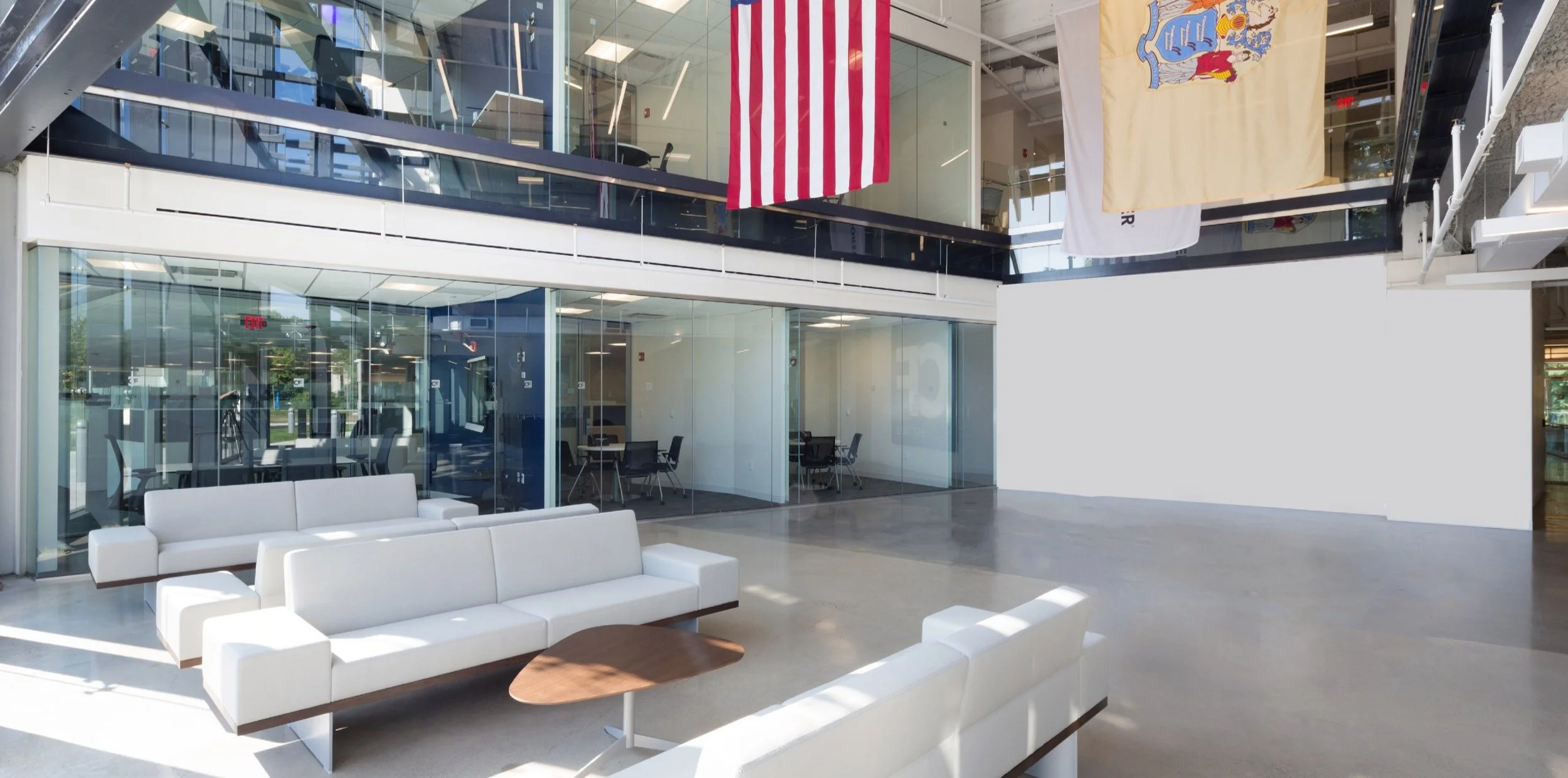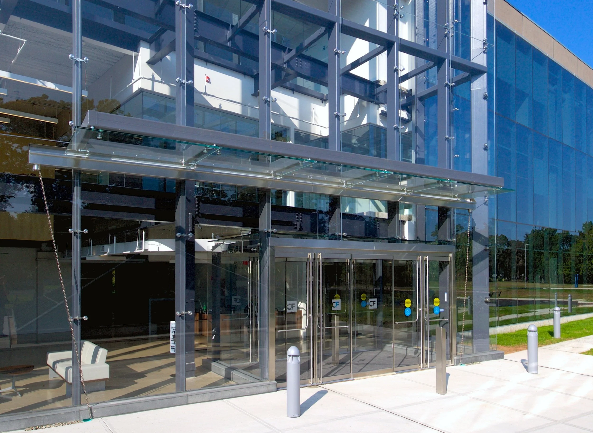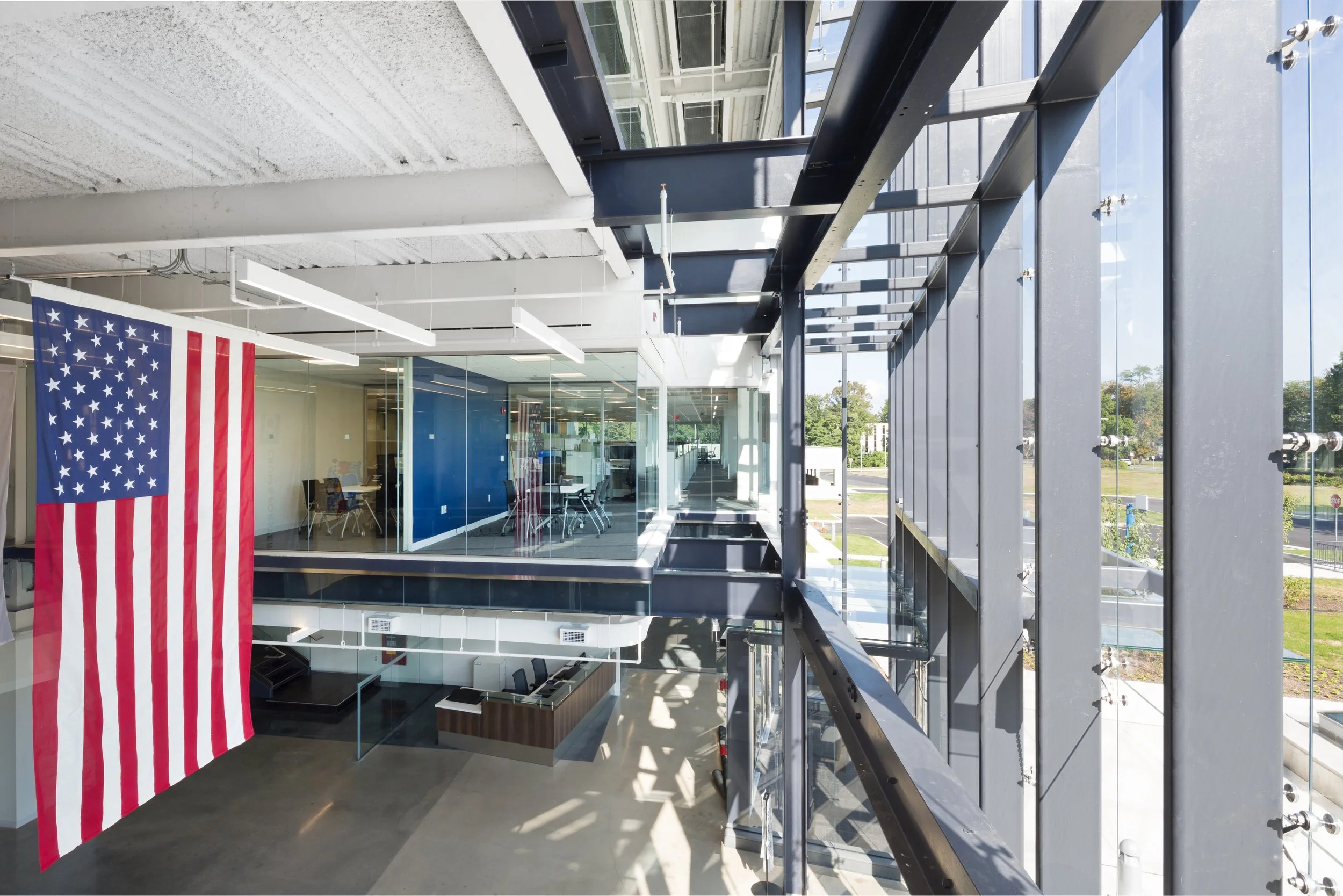 The restoration of this 1970 corporate headquarters building included new glass facades, an open atrium with an office, interior balcony, and stairs, open office, a 400 square foot pyramid skylit training center, and extensive amenity areas. Additionally, the renovation included a new 275 car parking deck, recreation spaces, an open plaza, and an onsite nature/fitness trail.