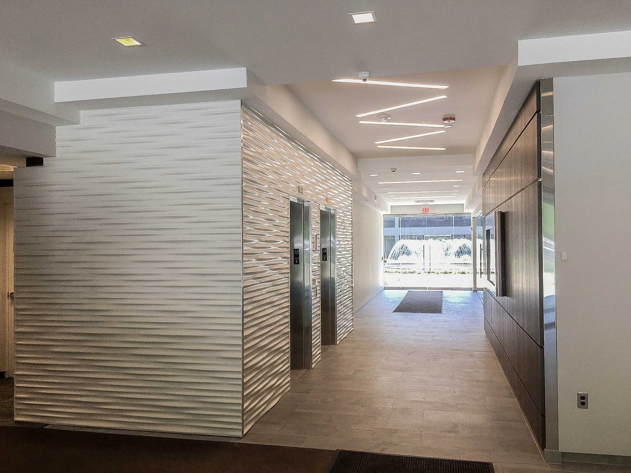 Dynamic wall panels and lighting installation provide a modern look to the elevator lobby while sleek materials enhance the bathroom experience. The interior efforts are complimented by the exterior upgrades, providing an overall elevated environment.