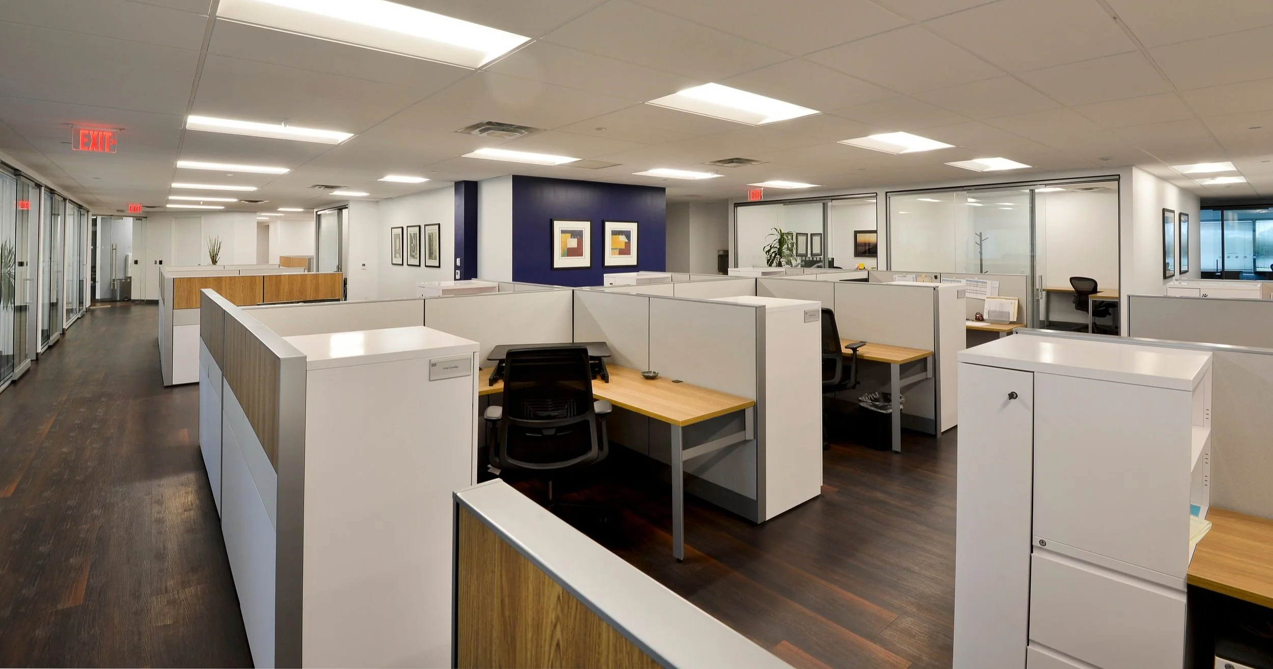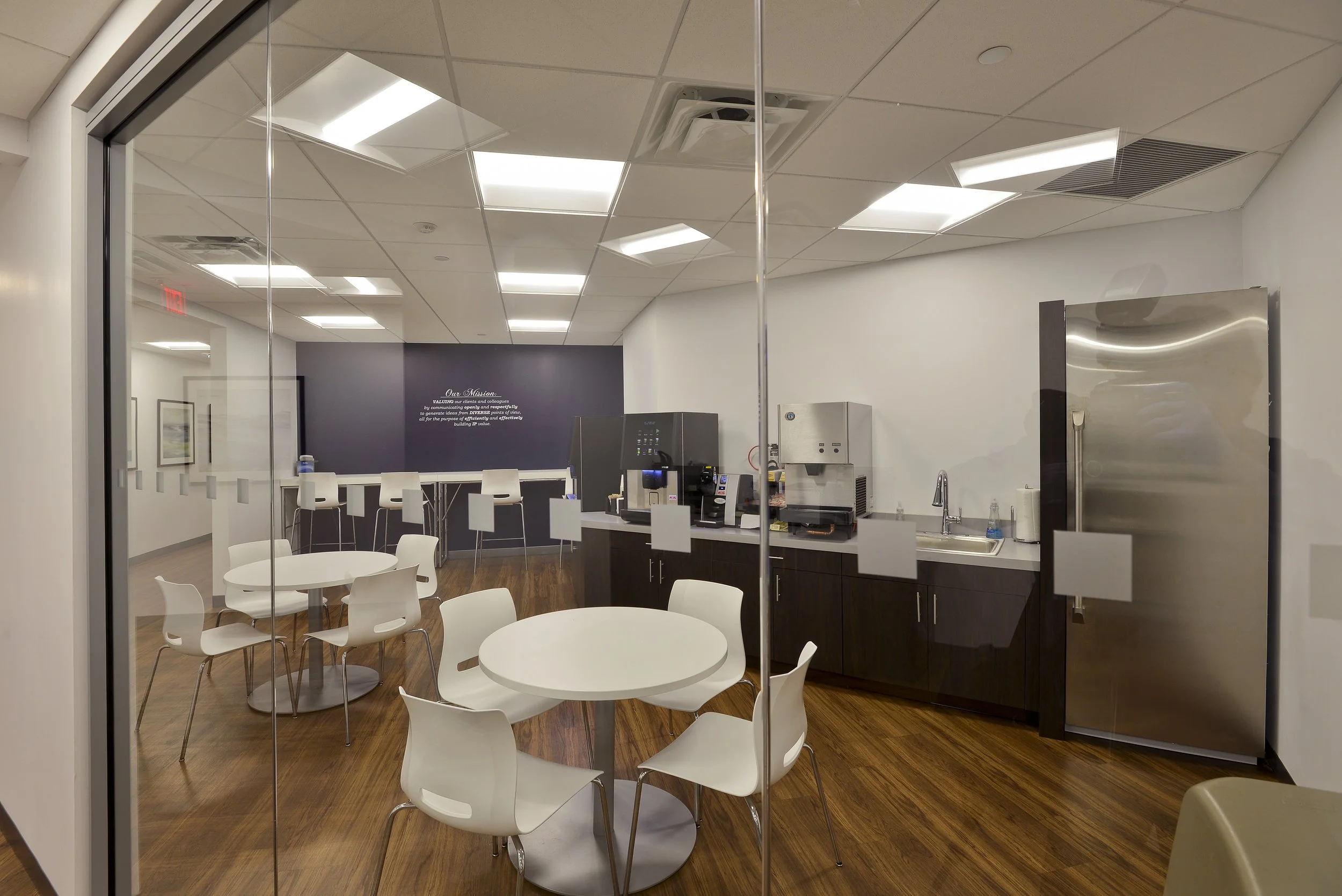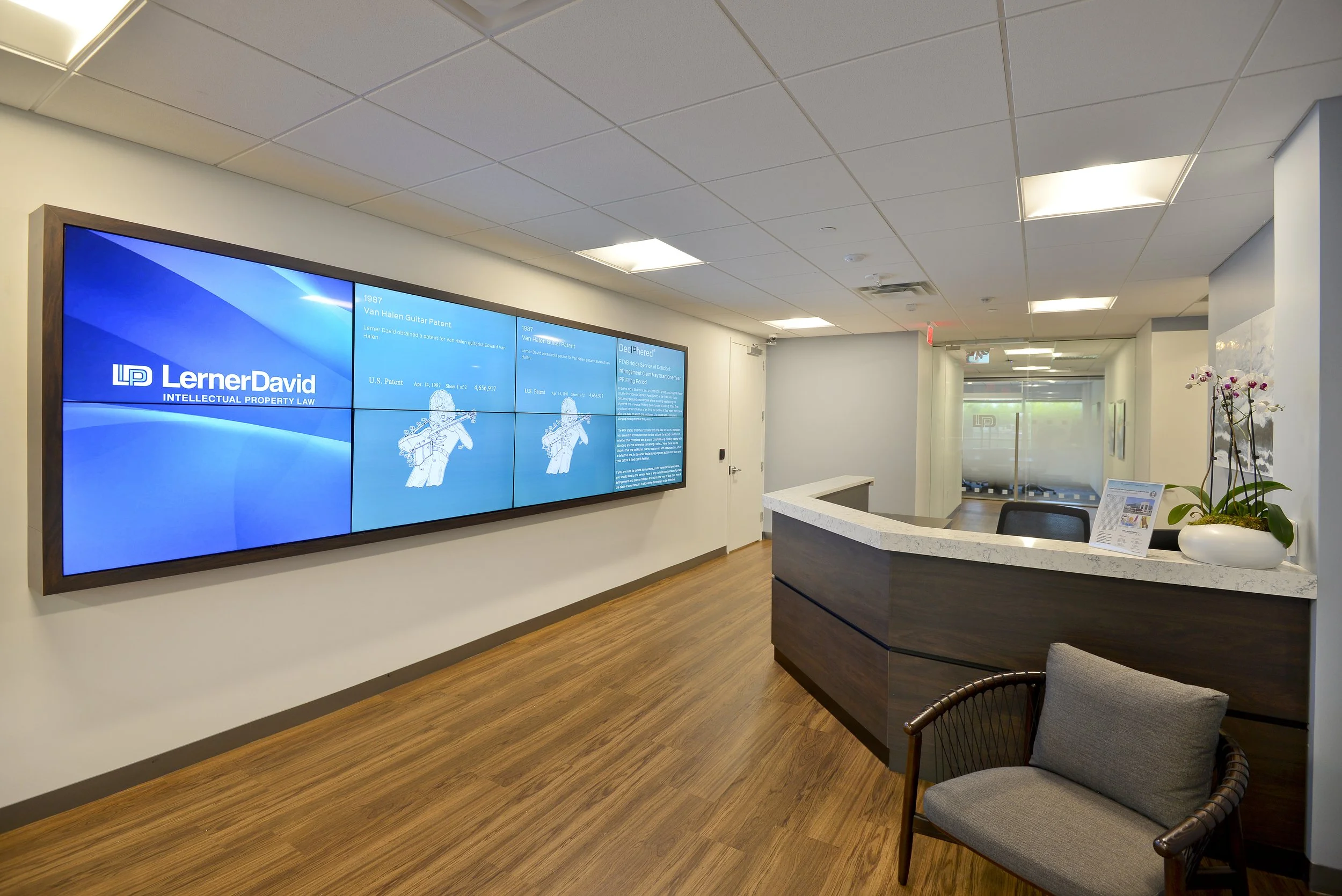The design is first visible in the reception area, which has eight large high-tech screens featuring the Lerner David’s visual branding elements, extending throughout the rest of the 35,000 SF headquarters.