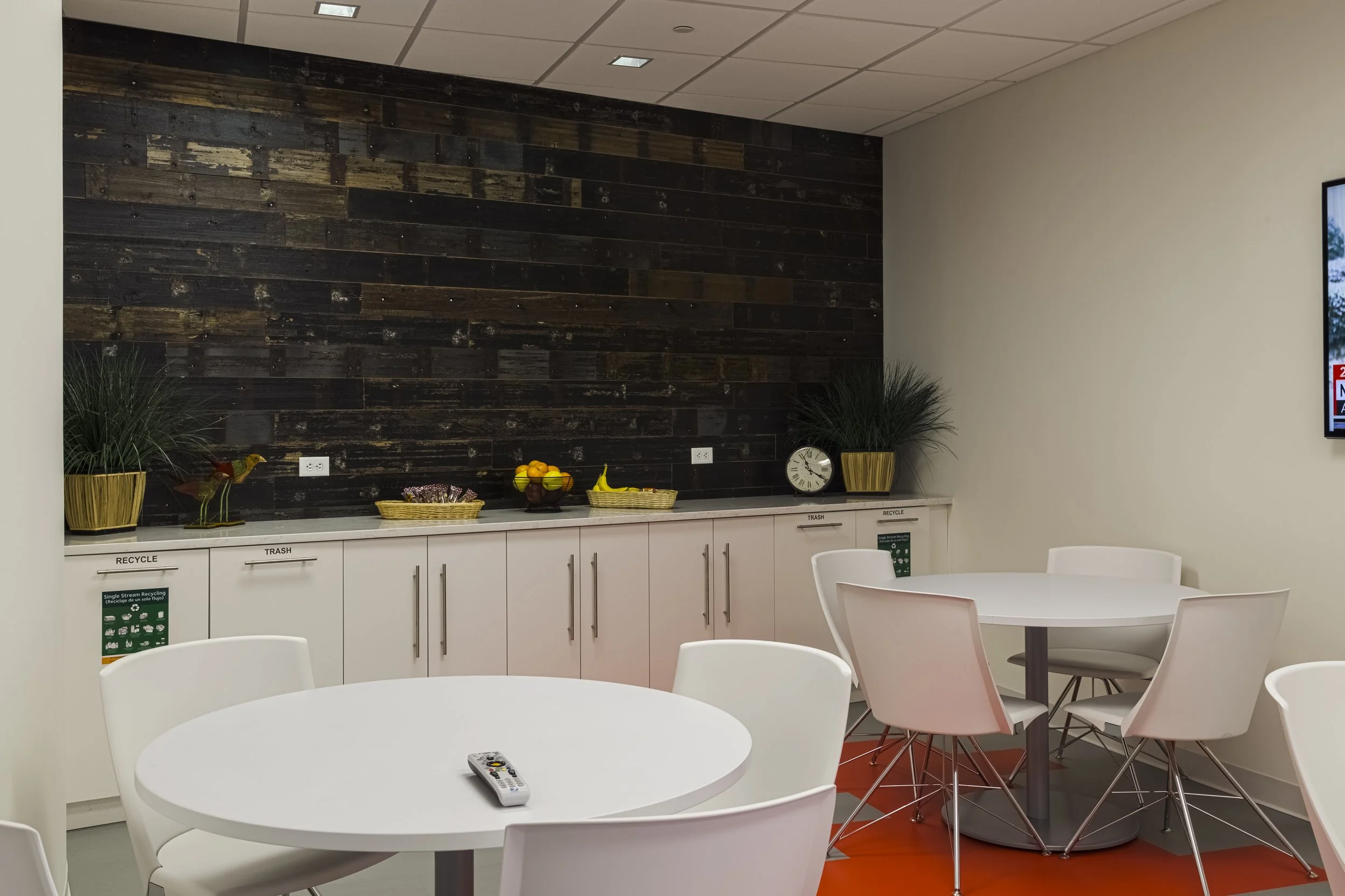 Our design team led with a very strong concept, better known as “The Thin Red Line”. The red line “moves” dynamically throughout the space; on the floor, up the wall, and across the ceiling in a 5” cove that slants down to a protruding soffit, and so on. Starting at the main entrance, in a band of red film with the company’s logo, the red line proceeds to touch almost every horizontal and vertical surface in the space. Raw materials, such as polished concrete floors and reclaimed wood wall paneling, contrast the glass office fronts and rich quartz stone surfaces.