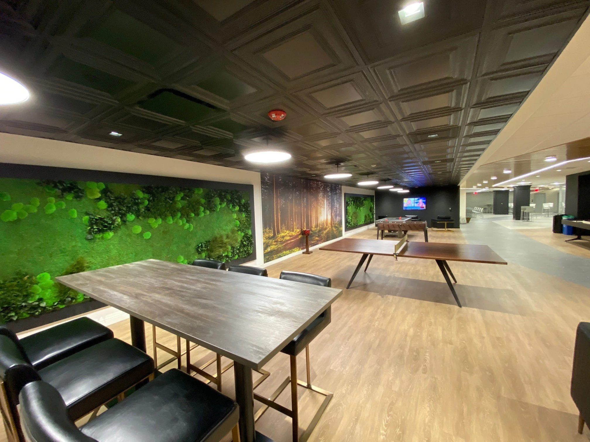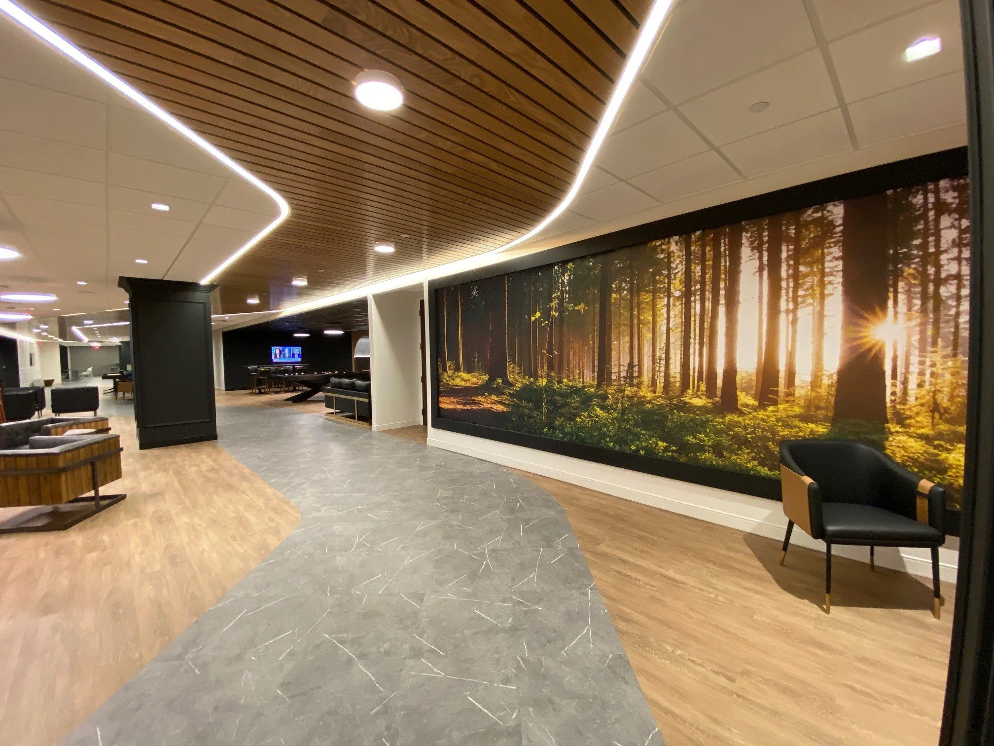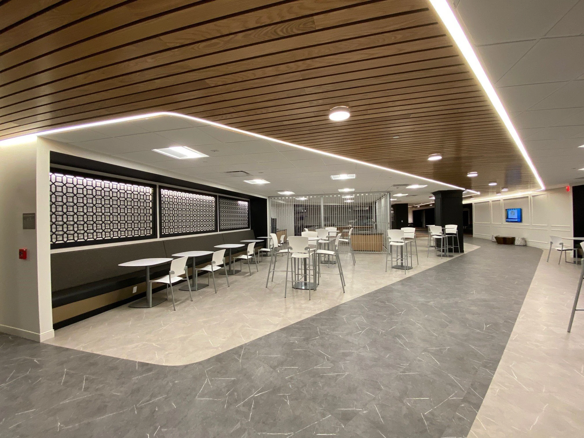 KNA was engaged to modernize all the amenity spaces at this Class A multi-building office center in Parsippany. It was starting to show its age in terms of its finishes, though not in its quality or care.