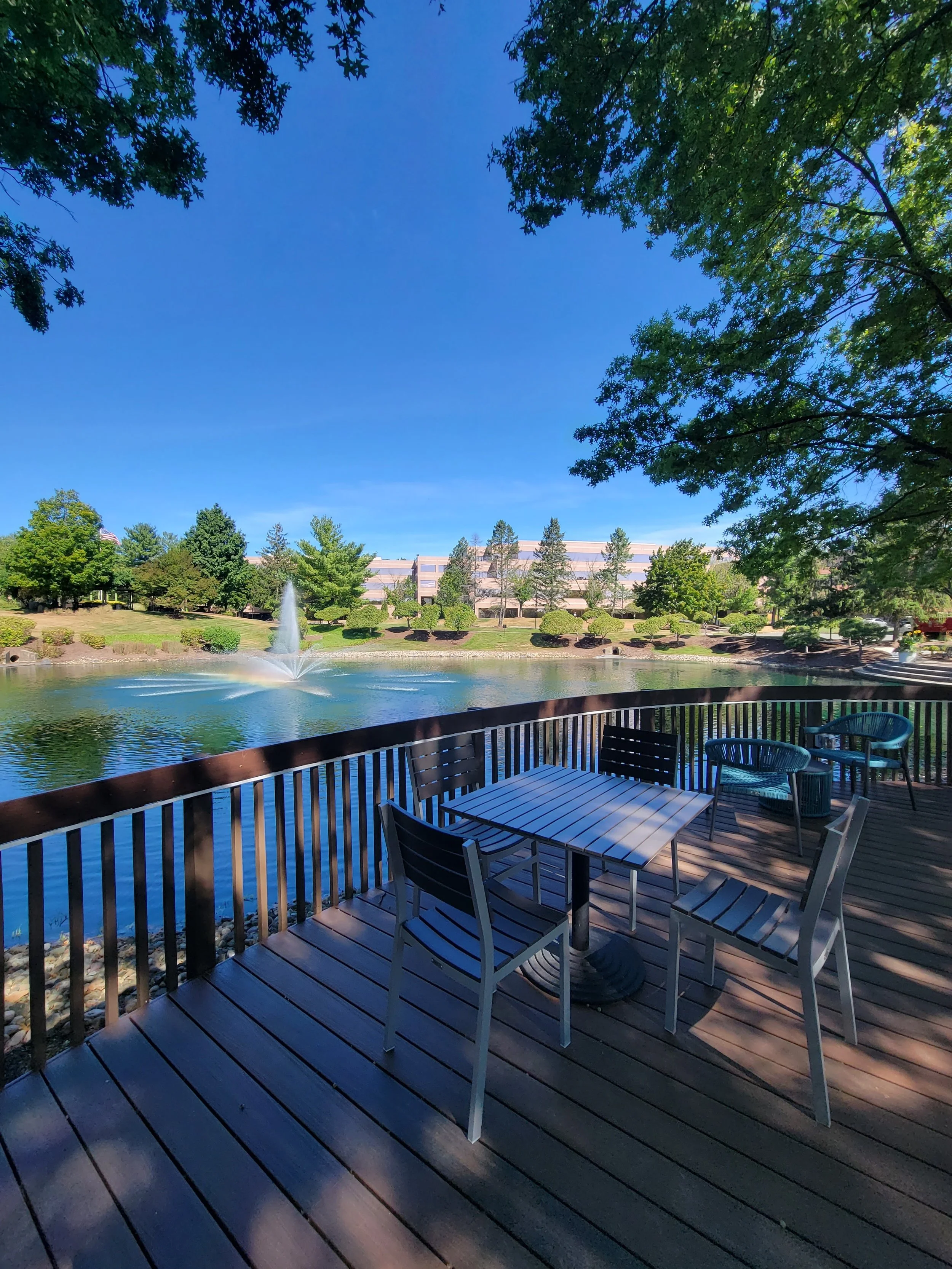 This is a two building complex set in a landscape and wooded area with a central pond in between the two building lots. Working with ownership, we created a walking and fitness path, complete with exterior gym stations. We added exterior eating and work/meeting areas and a bridge to span across the pond at the center and built exterior patio spaces with sheltered areas to create connectivity between the two buildings, which is important as there are shared amenity spaces in the buildings.