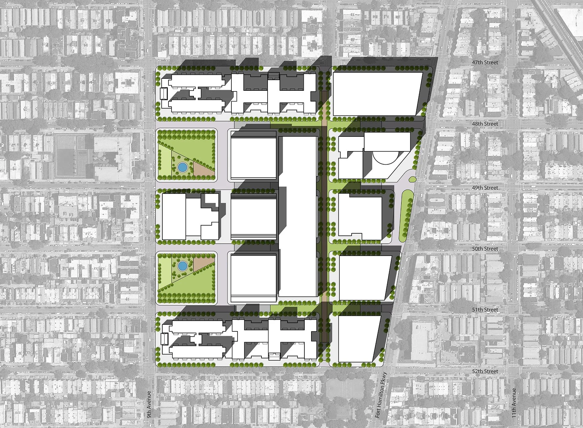 Conceptualized by Dr. Kimmerle. The idea for a joint master plan and exchange of air rights is an innovation. A significant outcome of the plan includes financial benefits to each institution as the assembled FAR / development rights were auctioned to commercial developers in this downtown Brooklyn / Green Park setting. Up to 1,100 housing units will be developed engendering new academic, health, and hospital space on site.
