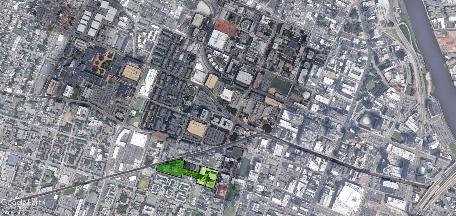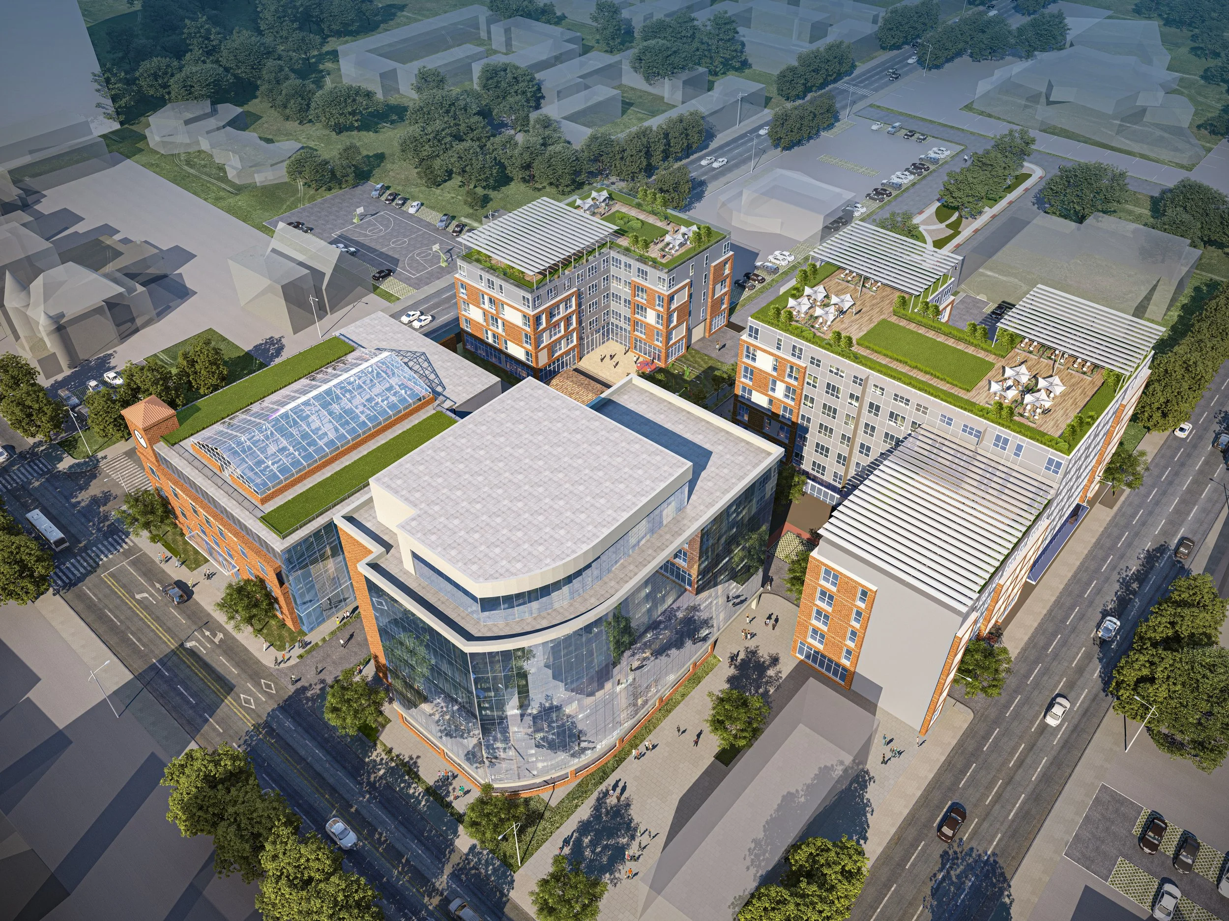 This is an infill campus plan on a third of a block, 1.5-acre site, adjacent to the largest Baptist Church in the city providing the following areas of needed services: Health care, Housing, Education, Social services, other amenities.